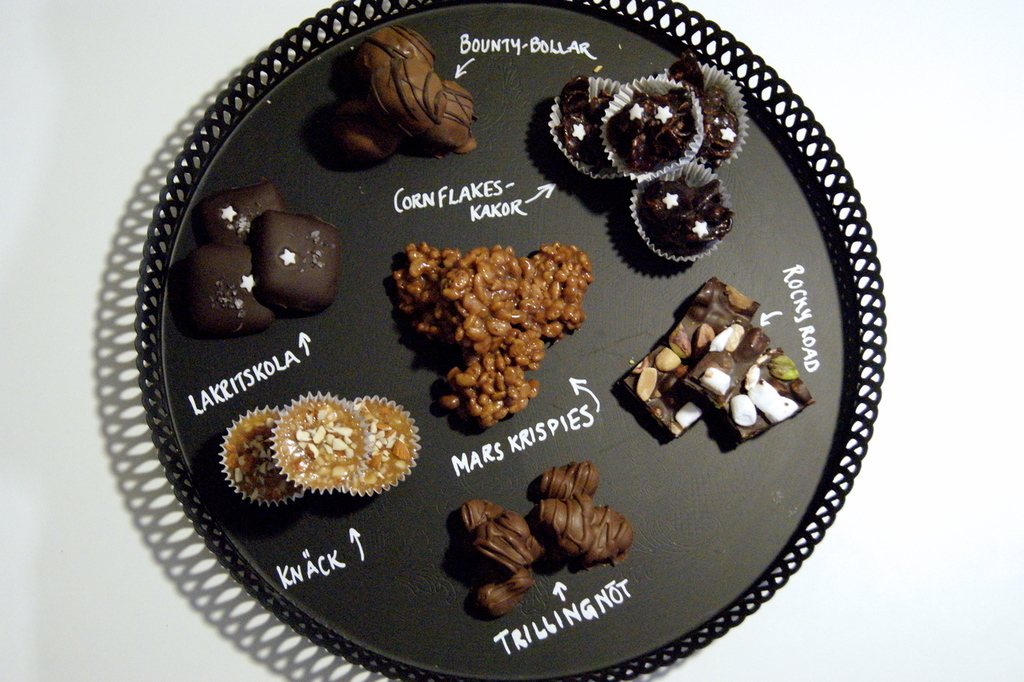 Massvis med julgodis: Knäck, Bountybollar, trillingnöt, cornflakeskakor, lakritskola, mars-krispies och rocky road. Nu ska alla dessa godisar packas i små fina paket, så får vi se vad tomten dyker upp med till alla mina nära och kära!