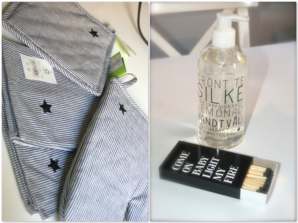 Även lite saker till hemmet: grytlapp, kökshanddukar och grytvante med söt stjärndetalj. Ny tvålpump, och dessa söta tändstickor kunde jag bara inte låta bli att köpa. 🙂