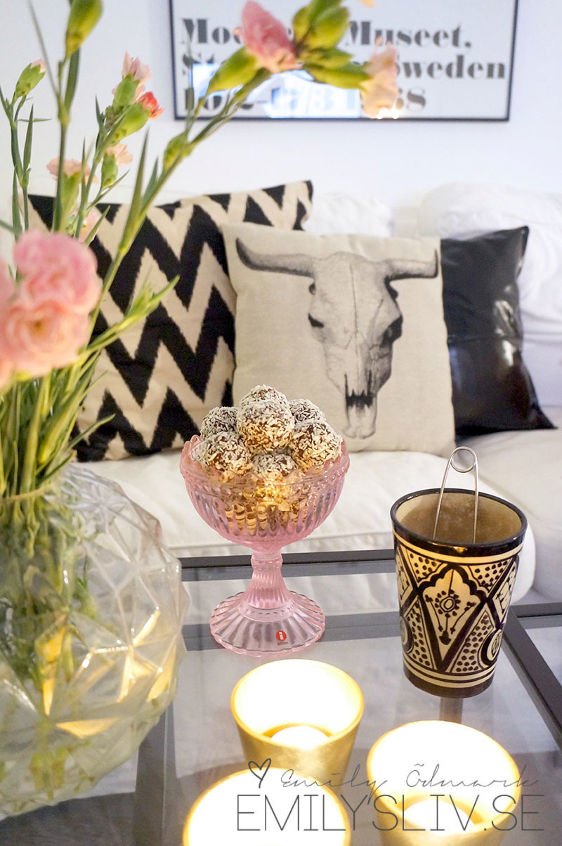 Ja det märks att det händer saker där inne i magen: spänner, drar, sticker, värker och molar mest hela tiden, trött är jag också, lämnade lite prover hos barnmorskan imorse och efter det åkte jag hem och la mig igen för att inte stiga upp förrän E gick till jobbet kring 18-tiden. Hur kan man vara så trött? Äsch, är väl bra att jag passar på att vila nu innan lill-skruttan kommer. 🙂 Inte har jag packat bb-väskan ännu heller, kommer liksom inte till skott, det får bli morgondagens projekt! Nu har jag landat i soffan och inväntar E, när han kommer blir det film, nya ”Fjällbackamorden” som kom idag, thé och en skål med ny-rullade chokladbollar!