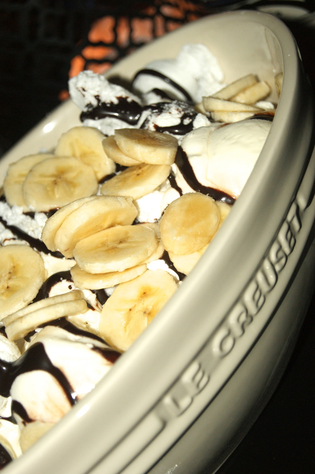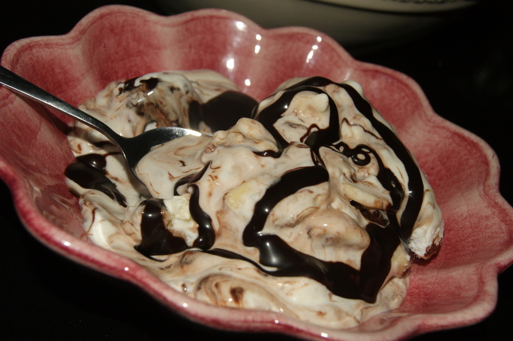 Kvällens gottis, inte riktigt i hälsans tecken. 😉 En rejäl glassbomb med maränger, grädde, chokladsås och banan. Jag tror jag kommer sprängas snart…