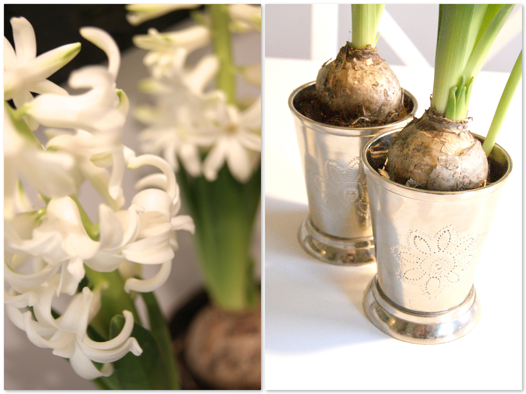 Hyacinterna som jag fick med mig hem förra helgen har börjat slå ut och doftar ljuvligt.