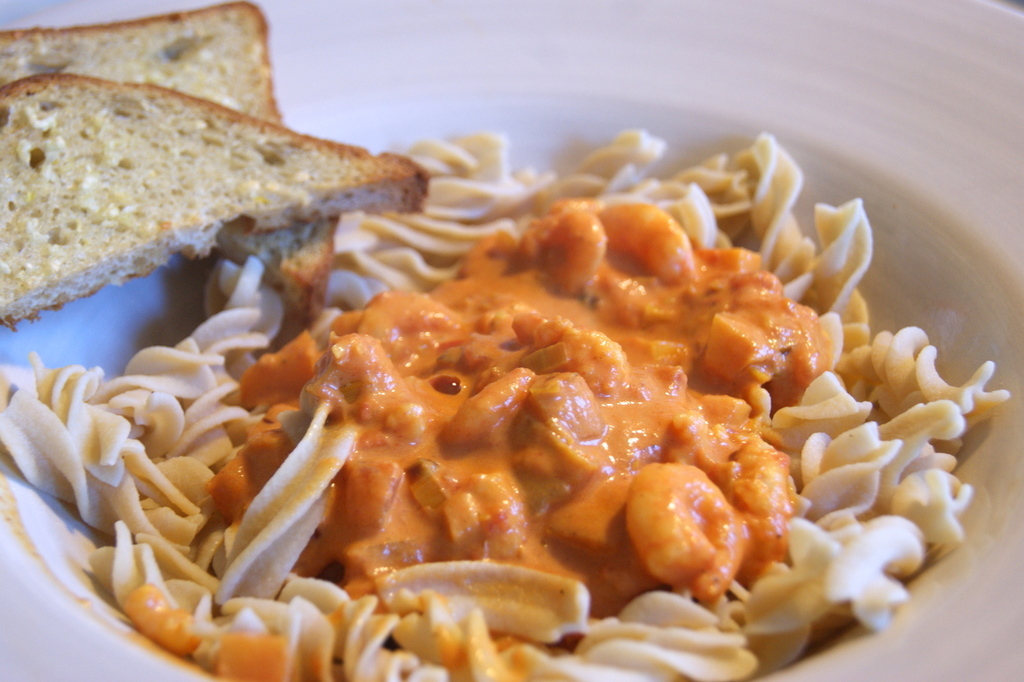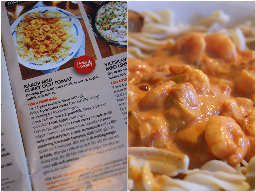 Tina 1 påse skalade räkor (400g). Koka 4 portioner pasta (LCHF-pasta eller vanlig väljer du själv). Ansa och strimla 1/2 purjolök. Dela, kärna ur och skär 1 rött äpple i tärningar. Fräs purjo, äpple och 1 msk curry i smör i någon minut. Blanda i 2 pressade vitlöksklyftor, 3 msk tomatpuré och 1 förpackning krossade tomater chili (400g). Låt sjuda ca. 5 minuter. Rör ner 2 dl grädde. Blanda i räkorna och låt allt bli varmt. Koka inte, för då blir räkorna sega. Smaka av med salt och peppar. Servera med pastan.