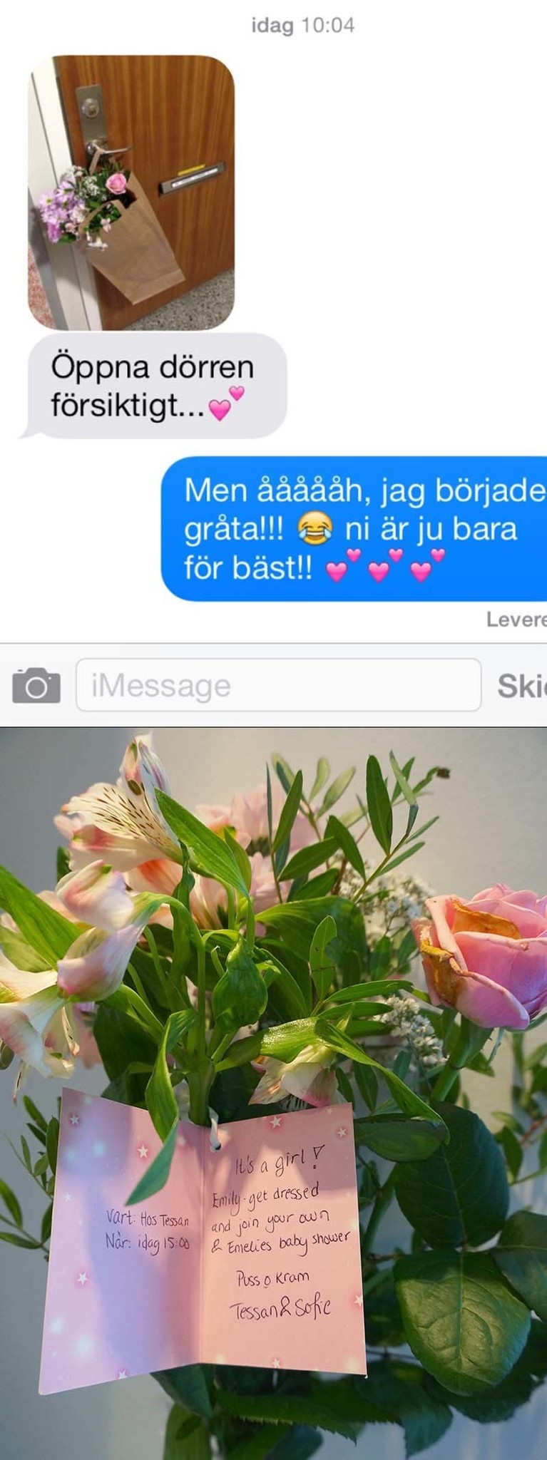Blev så överraskad att jag började stortjuta, var tvungen att läsa om kortet tre gånger & välte min kopp hallonbladsté som stått och dragit i 30min, bara börja om… haha. Hade inte ens i mina vildaste drömmar kunnat förutse detta. Är så tacksam för de fantastiska människorna jag har i min omgivning. Tror gravidhormonerna kommer få en kämpig dag idag, haha! 😉 Jag älskar er!